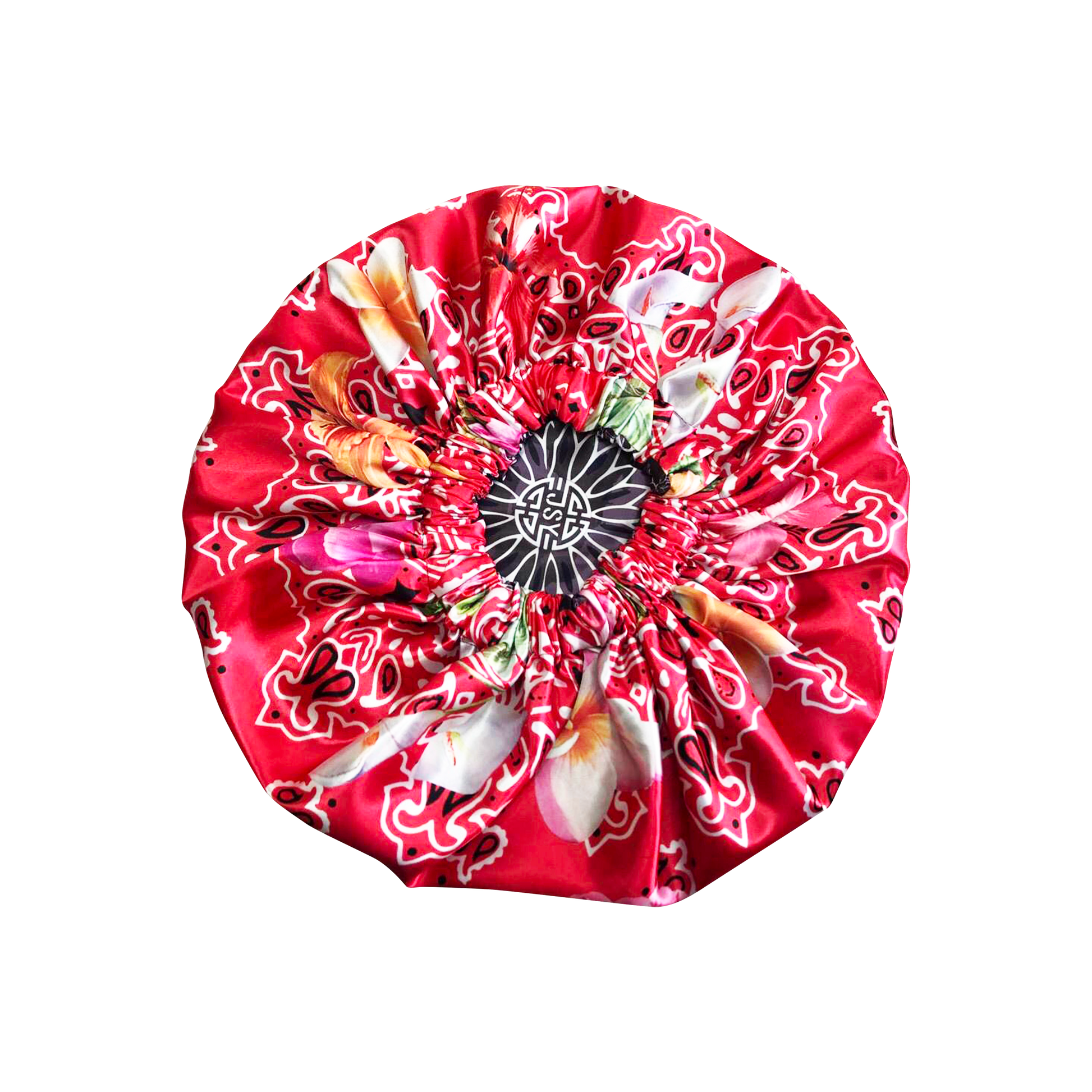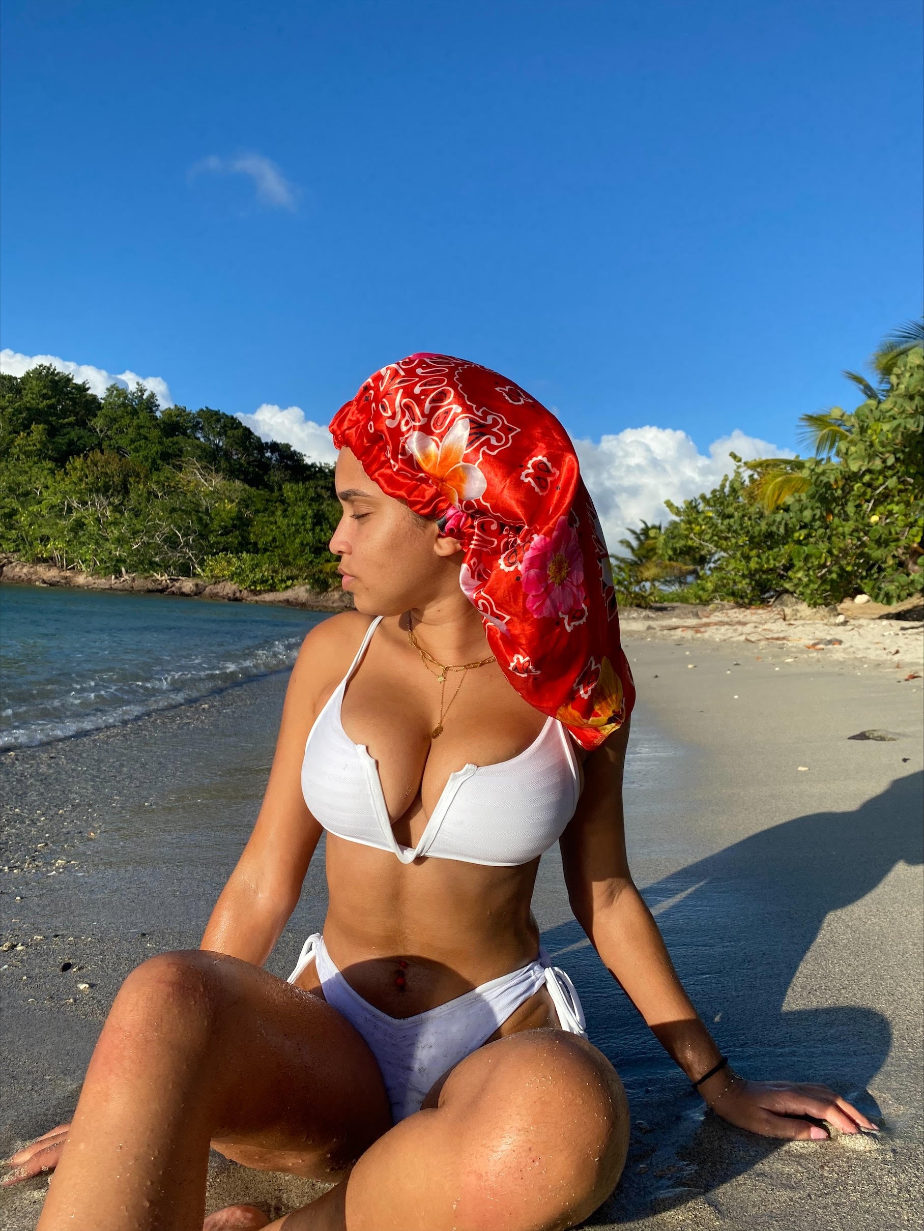 Bonnet bandana oversize fleuris. De dimension oversize ce bonnet est parfait pour toutes les chevelure. Le motif bandana est surplombé de fleurs tropicales en hommage a notre région : la Caraïbes