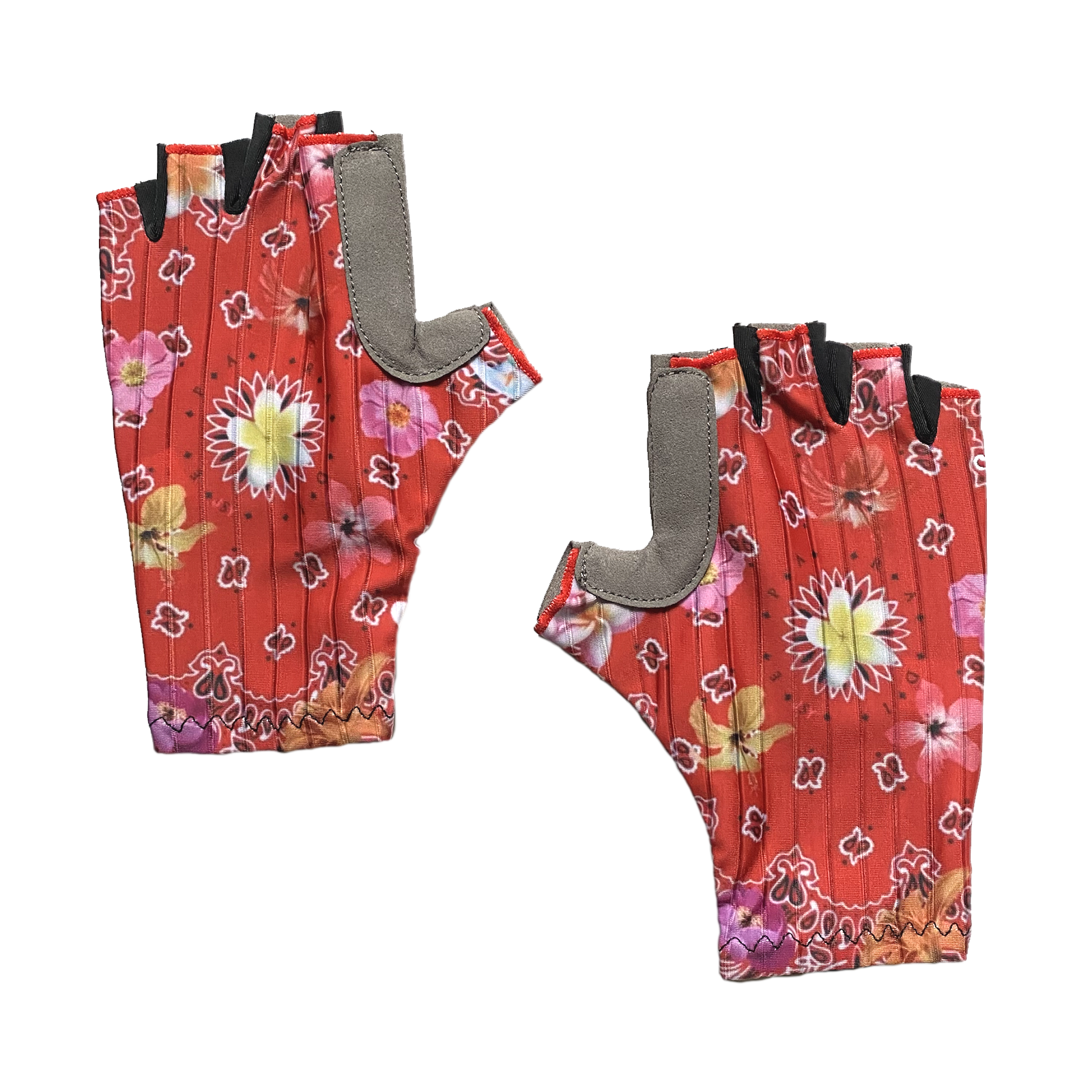 Gants de sport bandana fleuris. Le motif bandana est surplombé de fleurs tropicales en hommage a notre région : la Caraïbes