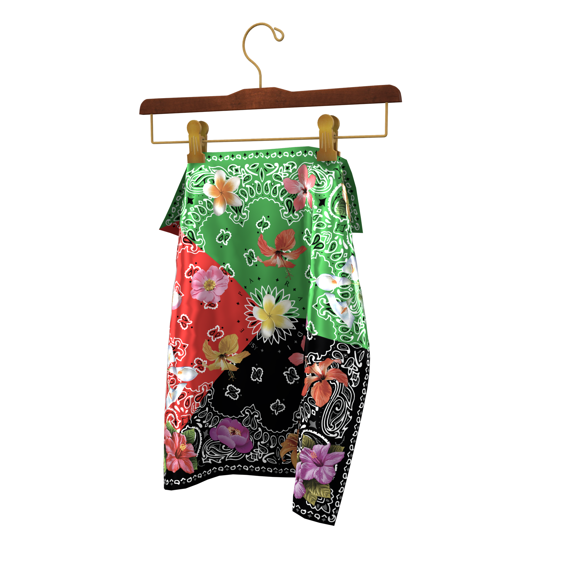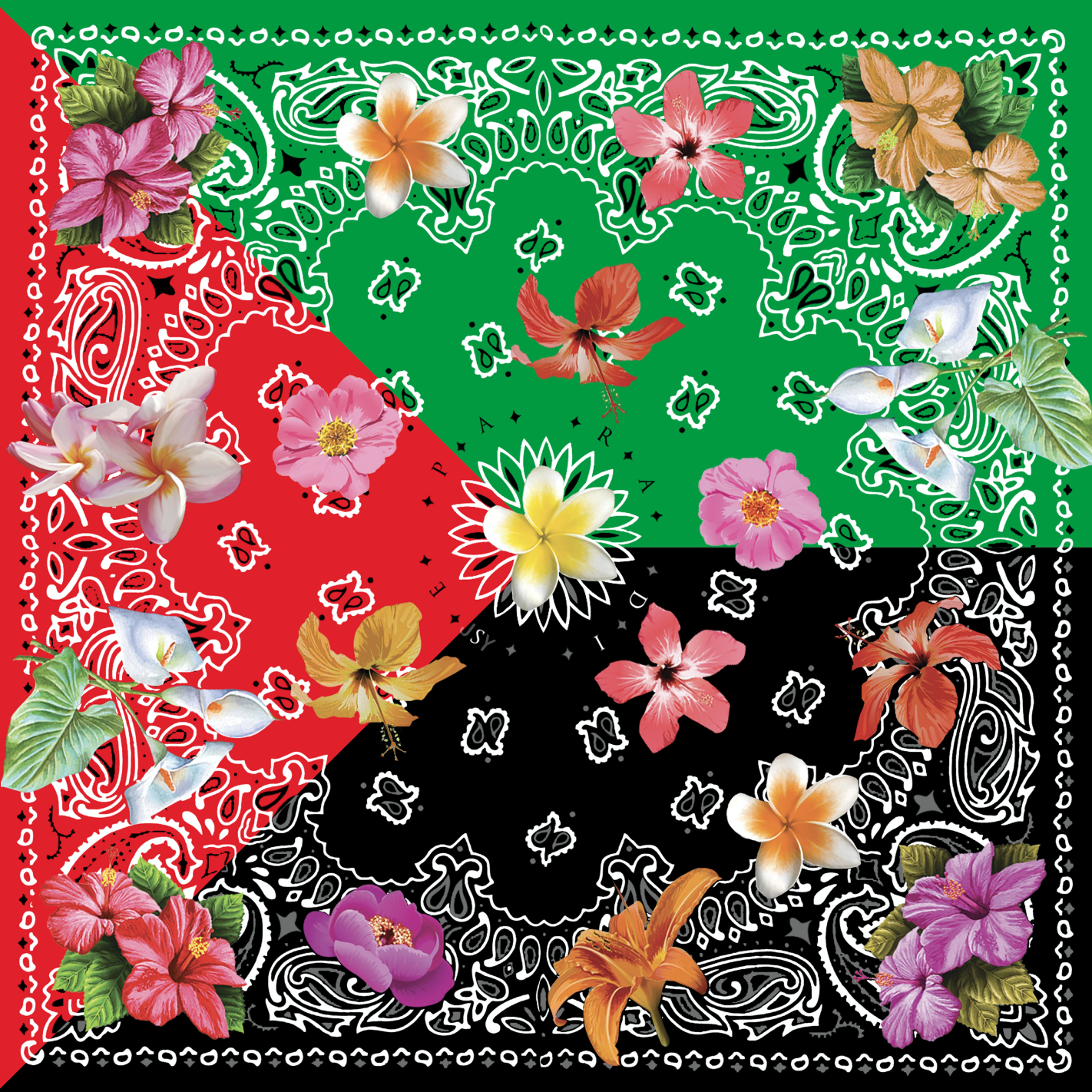 Bandana carré fleuris. De dimension 60cm de coté, ce foulard offre de multiples utilisations. Le motif bandana est surplombé de fleurs tropicales en hommage à notre région : les Caraïbes